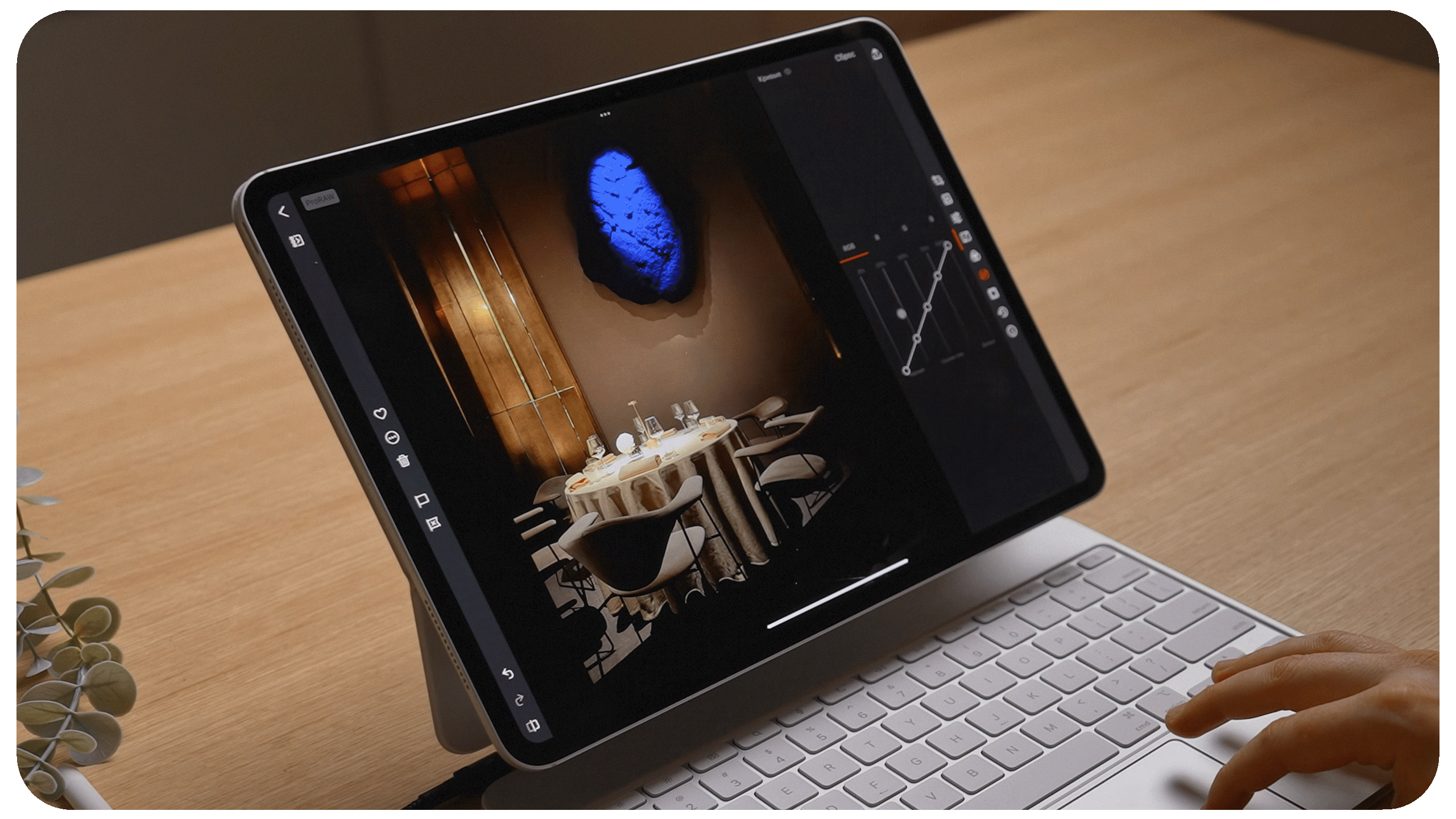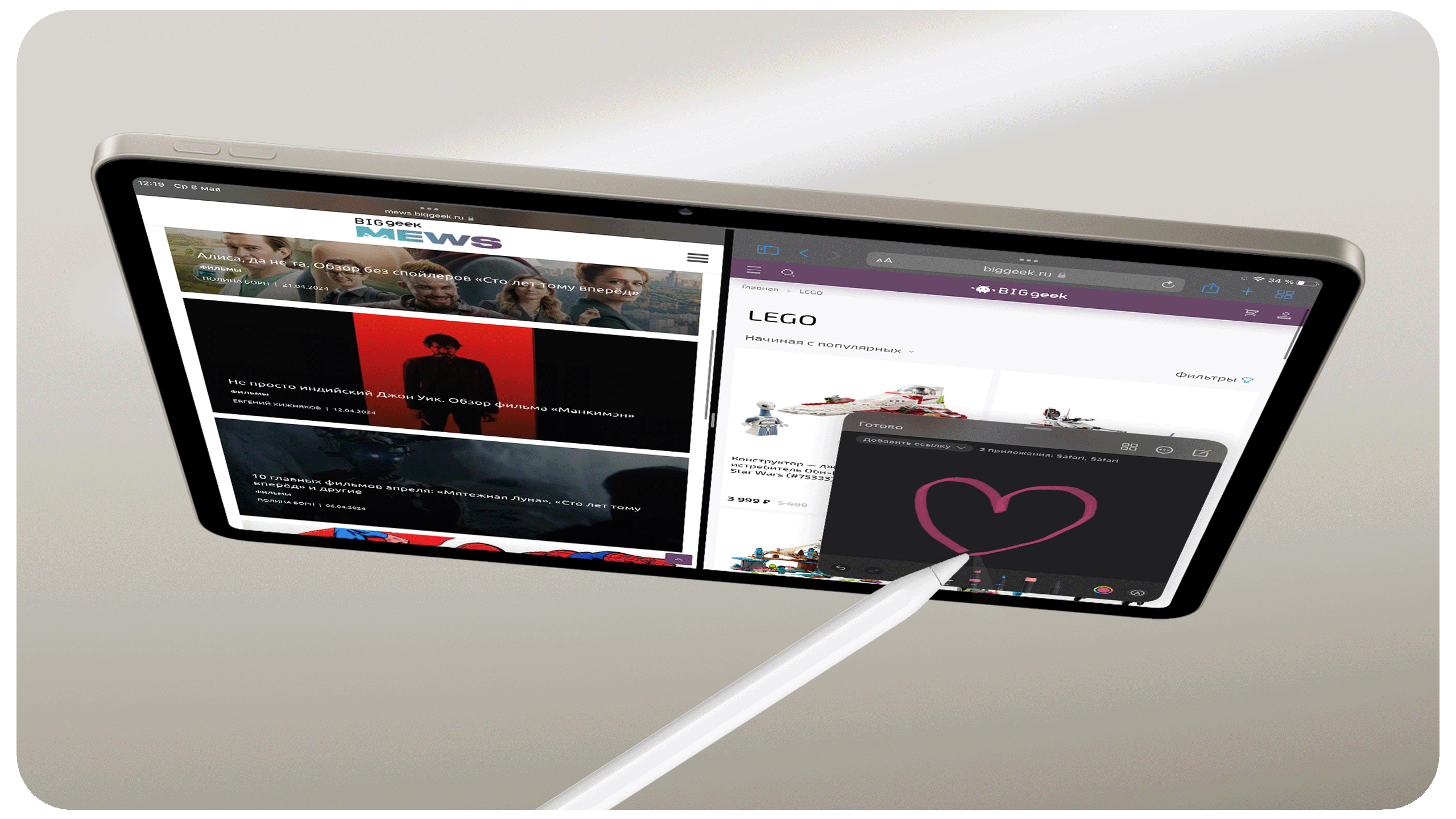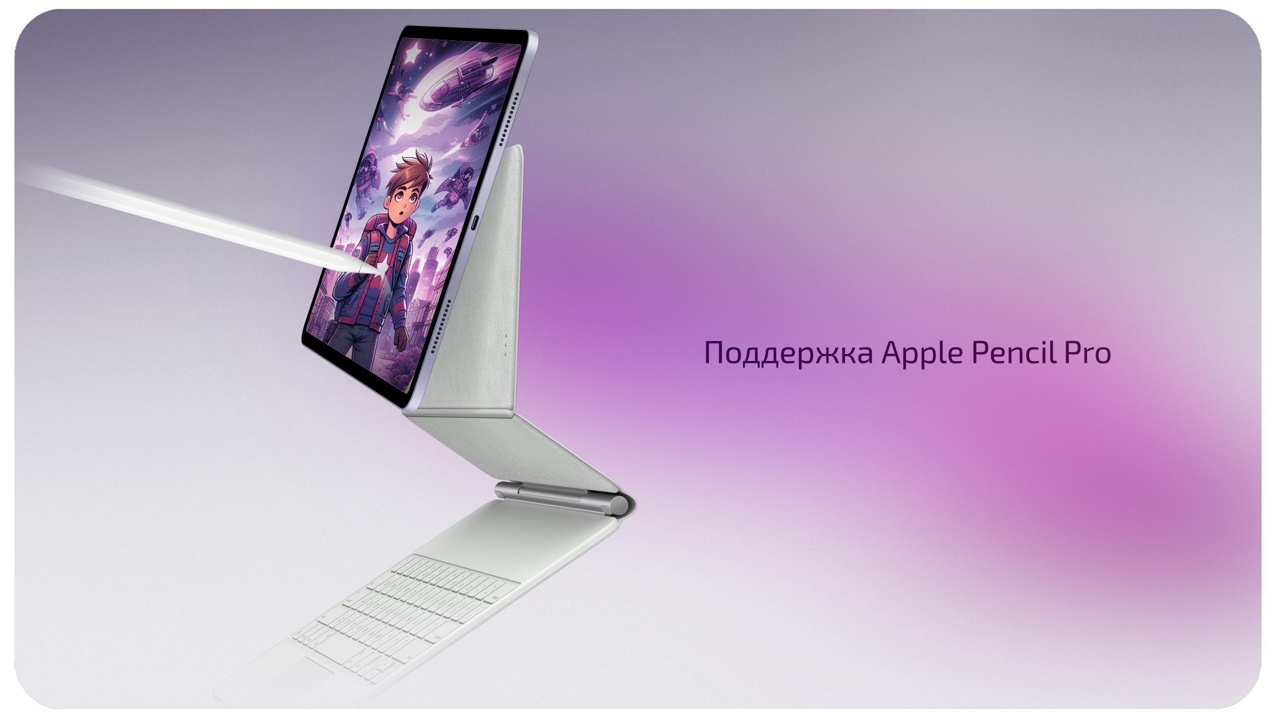 iPad Air поддерживает Apple Pencil Pro и Apple Pencil USB-C, которые превращают планшет в удобный инструмент для рисования, заметок и работы с графикой. Перо распознаёт силу нажатия и наклон, позволяя создавать более точные линии и штрихи. Технология определения положения стилуса над экраном помогает удобнее работать с инструментами редактирования и кистями в графических приложениях. При использовании Apple Pencil Pro доступна как магнитная зарядка, так и все его возможности, включая наведение (Hover). Также планшет имеет контактный порт Smart Connector для подключения клавиатур Apple без проводов.